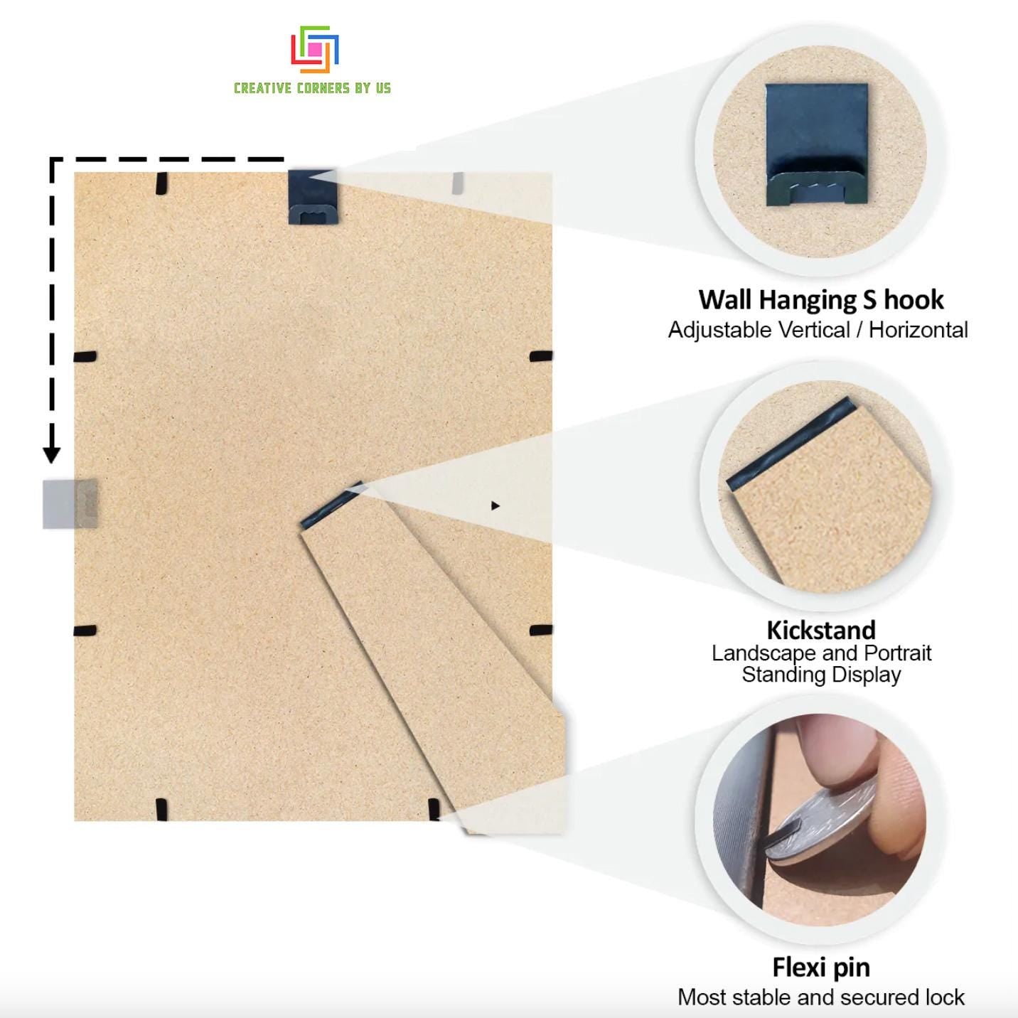 Each frame includes a kick-back stand and wall hanging clip, and is ready to hang or stand in portrait or landscape orientation.