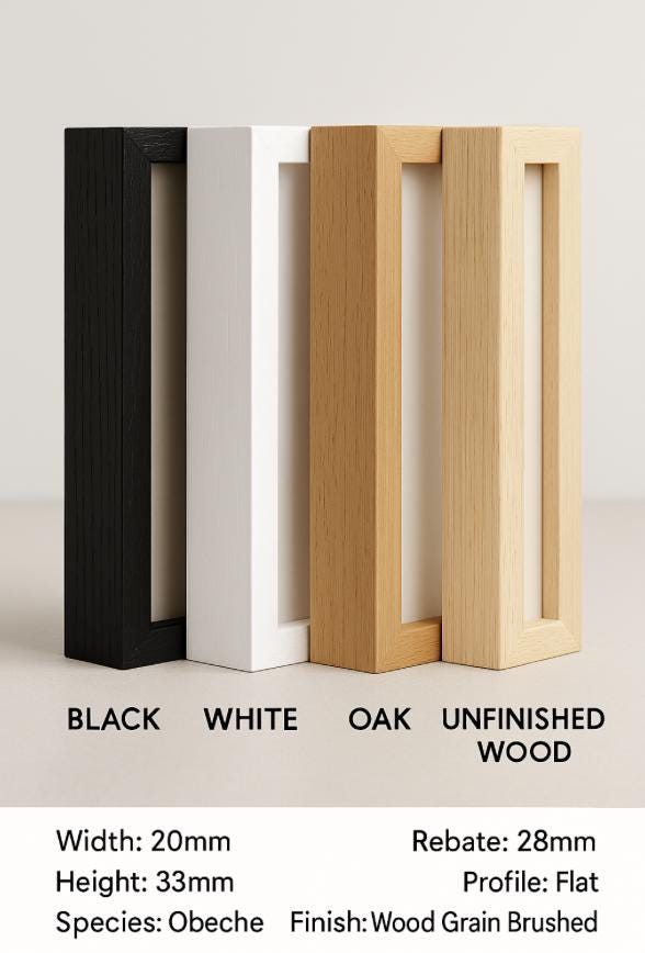 Frame Specs: Width: 20mm Height: 33mm Rebate: 28mm Material: Solid wood with a fine woodgrain finish Front: Crystal-clear, shatter-resistant plexiglass (ideal for safe shipping)