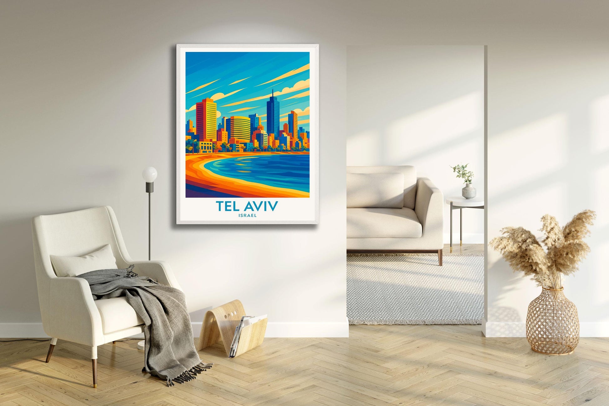Featuring the relaxed beauty of the Mediterranean coastline, iconic Bauhaus buildings, and the timeless atmosphere of Jaffa Old Town, this piece brings the energy of Israel’s most cosmopolitan city into your space. Perfect for travel memories, minimalist interiors, gallery walls, or as a thoughtful gift for someone who’s left their heart in Tel Aviv.